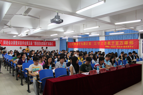 本届辩论赛为期四周,本着活跃校园气氛,开阔学生视野,丰富同学们的课余生活的宗旨,经过八系淘汰赛、四强半决赛等环节,最终,经济系代表队、管理系代表队杀入决赛。冠亚军争夺赛中,两队围绕着“代沟产生的主要责任在于子女还是父母”展开了激烈的辩论。参赛双方你来我往,唇枪舌剑却又不失风度,你攻我防,转换有序,赛场气氛慢慢升温。在自由辩论阶段,赛场气氛达到高潮,双方引用诸多实例辅以论证,观点新颖,思维灵活,妙语连珠,博得了满堂喝彩,充分展示了老王论坛 学子扎实的理论功底和宽广的知识面。整场比赛精彩纷呈,现场气氛活跃,评委和观众听得津津有味,不时爆发出笑声和热烈的掌声。比赛结束,田勇老师对本场比赛进行了详实的点评,在给予参赛选手肯定与鼓励的同时,也指出了双方存在的不足之处。随后,求是学会第七届理事会会长姚楚航作求是学会第五届“理论星光活动月”总结汇报,系统的梳理了求是学会第五届“理论星光活动月”的工作,并对求是学会未来的发展提出了希望。