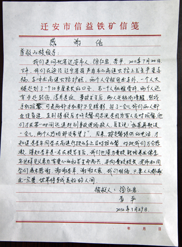 我们是河北省迁安市人徐红岩、李严,2011年7月20日下午,我们在途经辽宁省葫芦岛市的高速公路上发生严重车祸,车冲出高速公路护栏,两人全被甩出车外,一人大腿处划了一个10多厘米长的口子,另一人胸椎骨折,两人还有多处轻伤,浑身是血。事故发生后,两人头脑尚清醒,想找手机报警,可是两部手机都不见踪影,过了一会儿两人都出现昏迷,直到得救后才听交警同志说是因为有人及时报警,他们才在第一时间迅速赶到事故现场救人。医生说:“如果再耽搁一会儿,两个人恐怕都没希望了。”后来,按交警提供的电话,才知道是李平同学在高速行驶的车上及时报的警,对此我们万分感激。得知李平是一名在校大学生后,我们也深为贵校能培养出像李平这样见义勇为、有爱心的好学生而高兴,并向贵校领导、老师和同学们表示感谢,谢谢李平,谢谢大家!我们相信,只要人人都献出一点爱,世界将变成美好的人间。