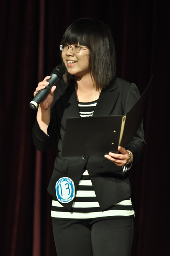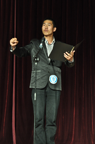 晚七时许,伴随着学生艺术团民乐团的合奏《赛马》,大赛正式拉开了帷幕。01号选手古鹏文一首配乐诗朗诵《祖国啊,我亲爱的祖国》,让现场观众深切地感受到新中国建设的艰辛,体会到他那种热爱祖国母亲的神情。07号选手段佳婕以一首感情充沛、富有激情的《中国,站在高高的脚手架上》获得了96.4的高分,并赢得了现场观众的热烈掌声。