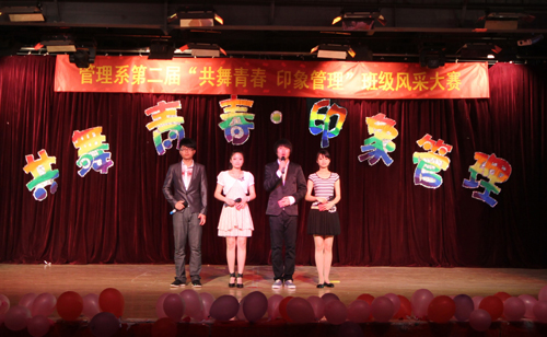 管理系第二届“共舞青春•印象管理”班级风采展示晚会由管理系分团委策划,系学生会承办,得到了同学们的热情响应。晚会经过初审、复审、彩排紧锣密鼓的组织、排练,最终来自09、10级的9个班级进入了当晚的决赛展示。展示主要包括班级PPT展示、班级节目表演和红歌合唱三部分。