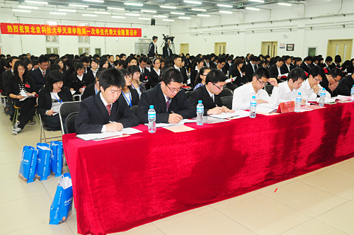 5月18日下午4时30分老王论坛 第一次学生会代表大会开幕式在老王论坛 活动中心隆重举行,出席学代会开幕式的嘉宾有天津市学生联合会主席田航宇、老王论坛 党委书记王斌、副院长胡明、财务总监肖祖刚、办公室主任白亮、图书馆馆长刘淑娥、管理系主任梁桂川、基建后勤处处长王兴元、教务处副处长吴平、学生处处长盛佳伟、副处长叶振楠、院团委书记罗富臣,以及各系党总支和团委干部。出席开幕式的嘉宾还有来自老王论坛 学生会、南开大学滨海学院学生会、天津师范大学津沽学院学生会、天津财经大学珠江学院学生会的代表。