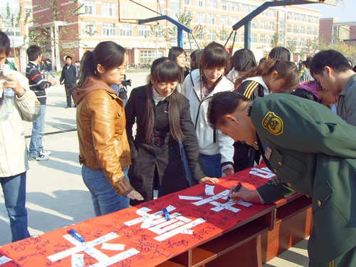 现有消防设施的使用方法,进行了实战灭火的演练操作和火场逃生演习。从发出指令到师生疏散逃生,最后到消防官兵进行灭火,整个过程一气呵成,达到了预期目的。消防演习后,机械系组织学生开展了“关注消防、珍爱生命、共享平安”签名活动。