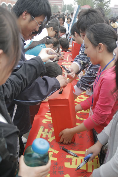 校长助理、天津学院院长张文明教授将捐款投入募捐箱内,并在写有“众志成城,抗震救灾,尽我薄力,情系灾民”的条幅上签下自己的名字,学院领导及中层领导干部、广大师生们纷纷捐款并在条幅上签字。表达关注灾情的心意及祝福灾区人民的爱心。
