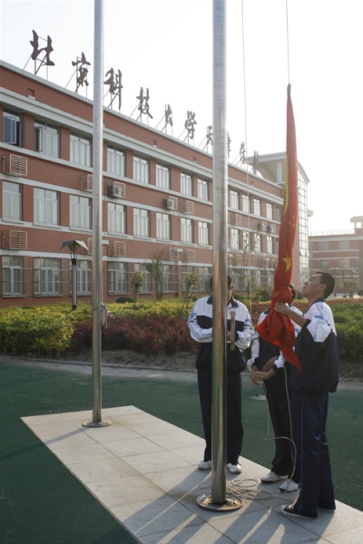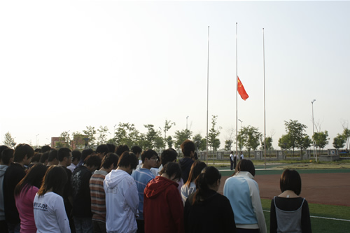 仪式开始,全体师生默默注视国旗缓慢升起,升旗结束,降半旗,全场默哀1分钟,共同为灾区受难同胞祈福。