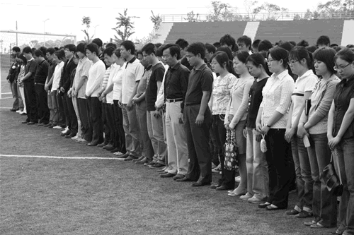 14时,全院教职员工及无课班级准时集结在体育场。14时20分,校园广播鸣响,全体人员表情肃穆、神态庄重。14时28分整,警报鸣响,全院师生默哀三分钟。