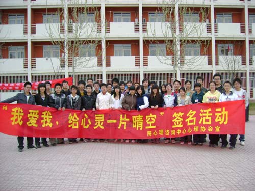 与会领导与各位辅导员率先在紧接下来的“我爱我,给心灵一片晴空”签名活动上签名。随后,各年级各班的心理委员和过往的同学们也都积极地投入到签名活动中。