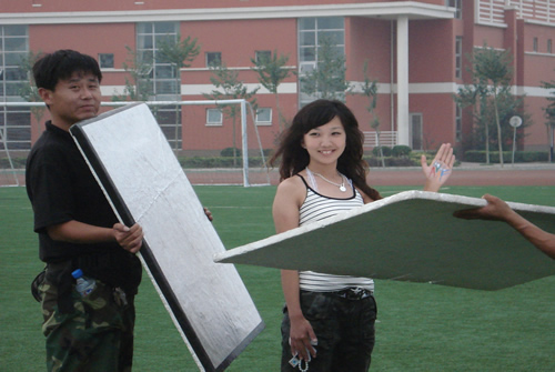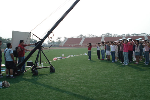 正值晌午,烈日当头,同学们在西操场严格遵守导演的安排,分别完成了用彩板拼成会标“AYAF”、全体举手欢呼、展示会旗、校旗、人物特写宣传等多个镜头。