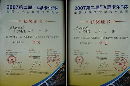 二队与一队分别以华北赛区第9名与第10名的成绩晋级全国总决赛,并荣获2007年第二届“飞思卡尔”杯全国大学生智能汽车竞赛华北赛区一等奖。
