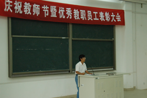 大会上,对15名优秀教职工代表进行了表彰。党委书记、常务副院长郭景文教授在会上宣读了院长张文明教授对全院教职员工的节日致辞,代表学院领导向全院广大教师和教育工作者致以节日的问候。郭院长指出,百年大计系于教育,教育大计系于教师,他感谢全院教职员工在两年多的建校时间中对学院各方面建设的大力支持与无私奉献,勉励大家再接再厉,为创造出天津学院的辉煌而继续努力。体育部教师单佳代表获奖教师发言。