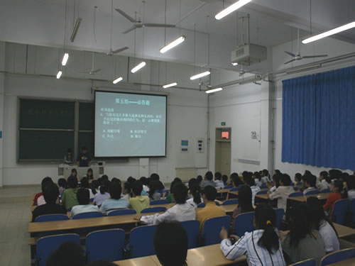 心理知识竞赛分预赛和决赛两个部分,参赛队为06级12个专业代表队。初赛分为必答题和风险题两个环节,各代表队选手积极作答,经过一轮角逐,法学、物流、信管专业各得30分,暂时领先于其它代表队。第二环节的风险题比赛,既考察了选手的知识储备,又考验了临场的发挥水平,各代表队的分数在此环节中拉开了距离。经过初赛,法学、土木、信计、会计、信管、通信六支专业队进入决赛,其它六个专业代表对选择自己支持的队伍成为后援队。