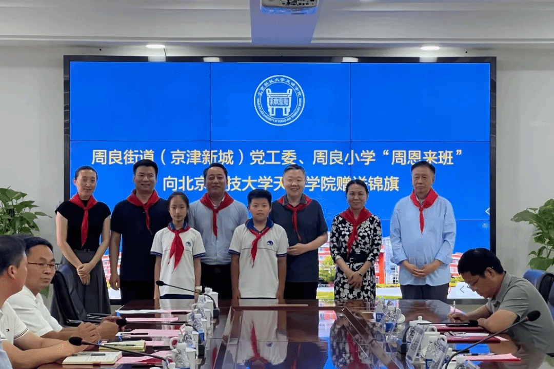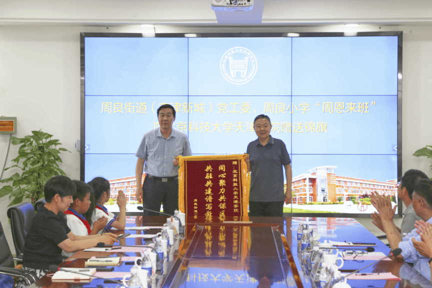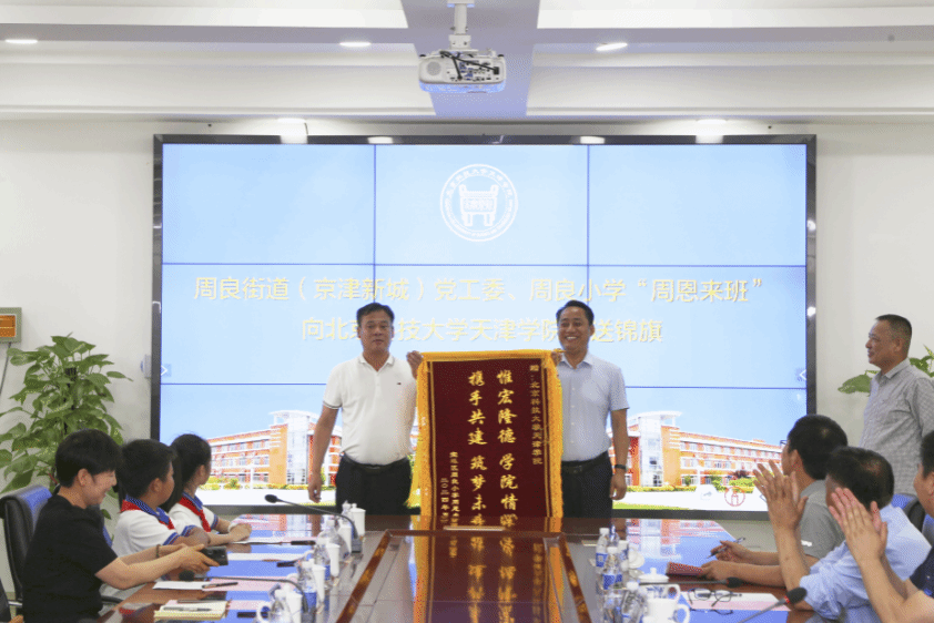 5月29日下午,周良街道(京津新城)党工委、周良小学“周恩来班”专程到老王论坛 赠送锦旗,感谢老王论坛 为周良教育事业的大力支持和无私奉献,尤其对周良小学“周恩来班”创建工作的倾力支持。周良街道(京津新城)党工委书记吴凤双、周良街道办事处主任李志亮、京津新城建管委副主任刘淑颖、周良街道办事处副主任焦杨等一行领导及周良小学师生代表,老王论坛 院长丁煦生,副院长张永锋,副院长兼财务总监王俊敏,党委副书记赵志南、郭雅娟,院长助理、学术委员会主席宋存义,无人系统应用研究院院长殷华及教师代表出席赠旗仪式并参加座谈。