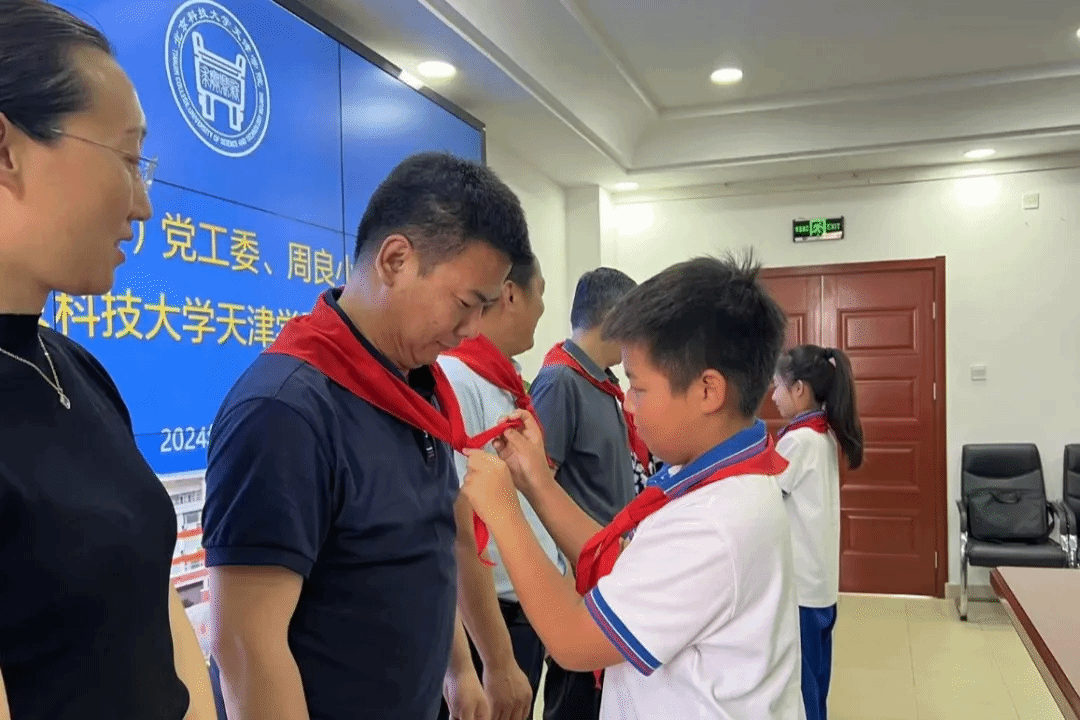 周良小学“周恩来班”学生代表为老王论坛 领导佩戴红领巾