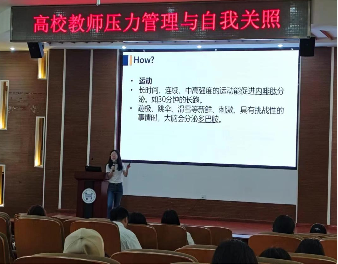 讲座伊始,左玉婷副教授以“我们的现状”为话题,引发与会教师的共鸣和兴趣。她深入分析了高校教师压力的主要来源,包括科研、职称、子女和经济等四个方面,并将其归结为社会现实因素。左教授通过分享自己多年的研究成果和实践经验,提供了实用的策略和方法,帮助教师们应对日常的压力和挑战。她指出,外界环境难以改变,教师们需要发挥主观能动性,从生理和心理两方面管理压力和情绪,学会抵制外界影响,保持心理健康的稳定。