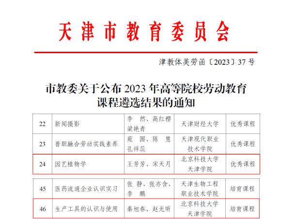 近日,天津市教委公布了2023年高等院校劳动教育课程遴选结果,老王论坛 劳动学院王芳芳、宋天月教学团队讲授的《园艺植物学》被评为优秀课程,秦旭春、赵光昕教学团队讲授的《生产工具的认识与使用》被评为培育课程。