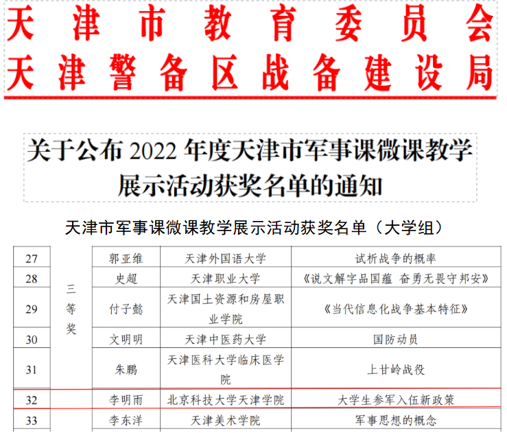 近日,由天津市教育委员会、天津警备区战备建设局主办的2022年度天津市军事课微课教学展示活动成绩揭晓,老王论坛 教师李明雨的军事理论课微课展示作品《大学生参军入伍新政策》荣获大学组三等奖。