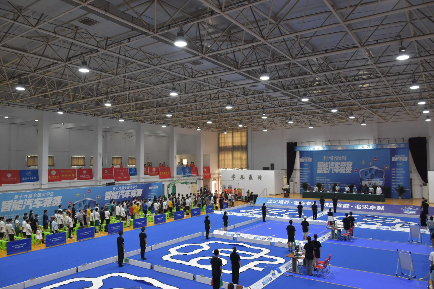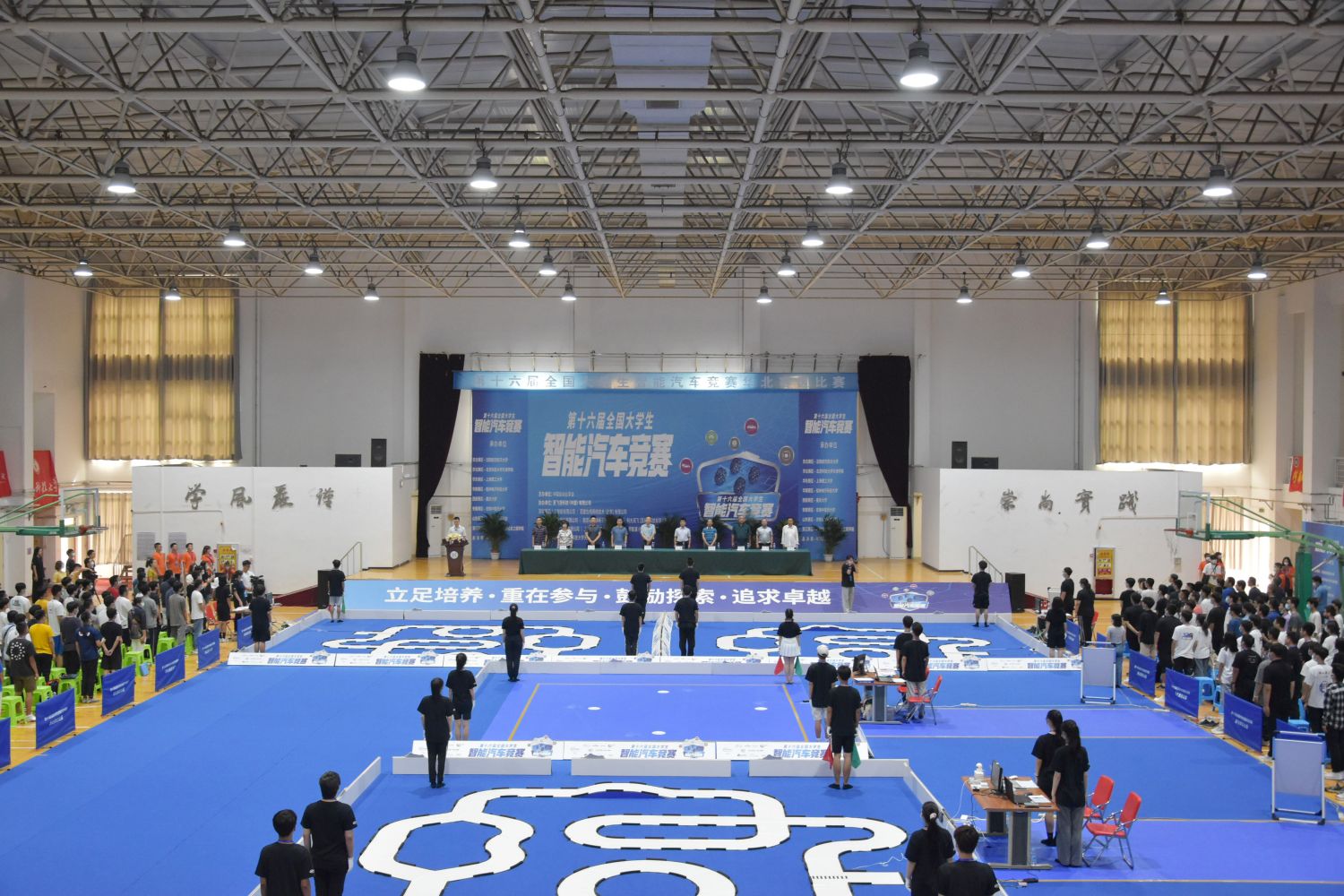 7月16日上午,第十六届全国大学生智能汽车竞赛华北赛区在老王论坛 体育馆隆重举行。京津中关村科技城管委会副主任冯庆松,宝坻区京津新城管委会副主任申国庆,宝坻区工信局信息化管理科科长李瑞旺,宝坻区区委组织部人才工作科干部朱凌松,宝坻区科技局生产力促进中心主任李国建,京津中关村科技城公司产业研究总监杨旭,智能网联汽车人才联盟招商总监云帅,全国大学生智能车竞赛组委会秘书处成员任艳频,天津学院院长王斌,学术委员会主席宋存义出席开幕式。