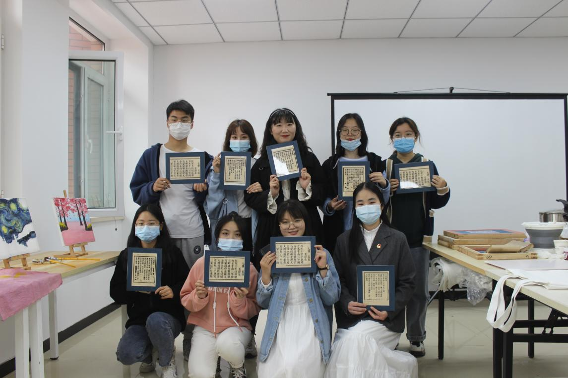 刚到此处,相关人员便热情地带领我们参观了民族团结展厅和社区网格管理工作室,我深刻感受到了党全心全意为人民服务的宗旨。之后,我们便开始了实践活动,一开始进行了活字印刷,该项目很好地结合了党史学习和中华优秀传统文化元素,在相关人员耐心的介绍与讲解后,老师和同学们一起用心地完成《入党誓词》和《七律·长征》的印刷体验;接着就是进行分组创作活动,一个小组以建党100周年为主题,进行帆布包绘画,另一个小组进行手工制作小红牛挂件;然后就是党史拼图,大家依据自己对党史的了解与熟悉程度,完成拼图。接下来,就是参与全维度心理测评,该测评是社区在疫情期间关心居民心理健康的方式之一;最后,我们一起在纸板上印上了自己的各色手印,是学习之余欢乐的印记、充实的印记。活动结束后集体进行了合影留念。