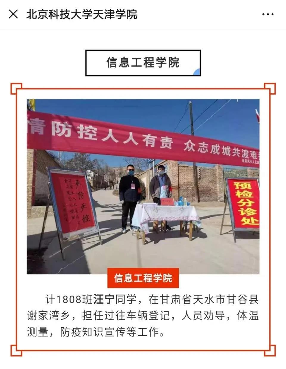 疫情发生以后,他看到湖北红十字会接受社会各界捐款捐物的公告后,便毫不犹豫,拿出400元,通过武汉市慈善总会官微,捐给武汉一线,助力早日战胜疫情防控。在抗击疫情关键时刻,他又一次慷慨解囊,主动联系共青团甘谷县委的负责人,为团组织上交了100元的特殊团费。“作为一名入党积极分子和学生干部,我主动向共青团甘谷县委上交100元特殊团费,助力我县早日战胜新冠肺炎疫情。虽然不多,但是是我的一点心意。”这段话,是他在微信上给共青团甘谷县委负责人的留言。“青年一代有理想,有本领,有担当,国家就有前途,民族就有希望”一直是汪宁坚信的一句话。他无私奉献的这种精神,也激励了其他大学生志愿者。
