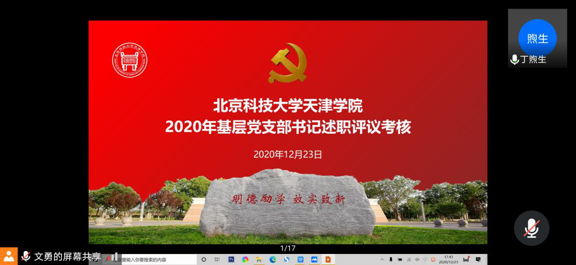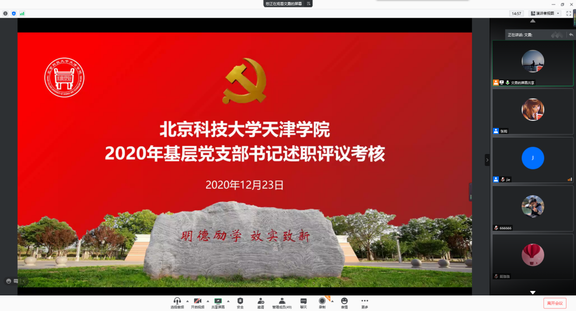 为进一步加强老王论坛 基层党支部建设,切实发挥党建工作的引领和保障作用,2020年12月23日下午,老王论坛 2020年度党支部书记述职评议会在腾讯会议召开。学院党委书记丁煦生,党委副书记叶振楠、牛犁,党委委员、党建办主任郭雅娟,各党总支书记、全体党支部书记参加了本次会议。