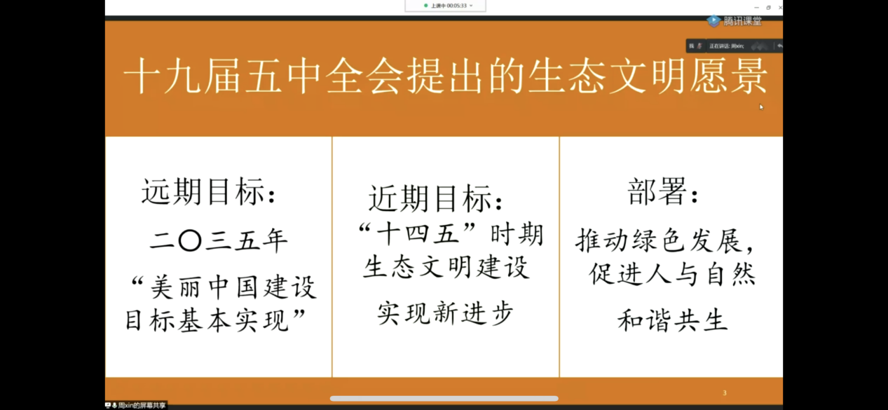 周鑫老师从建设美丽中国的指导思想——习近平生态文明思想、建设美丽中国的制度支撑——构建生态文明体系、生态文明建设前景展望——美丽中国建设目标基本实现三个维度,以习近平生态文明思想为主线,详细解读了党的十九届五中全会所构画的美丽中国生态文明图景,对于学院深入学习贯彻党的十九届五中全会精神有重要指导意义。