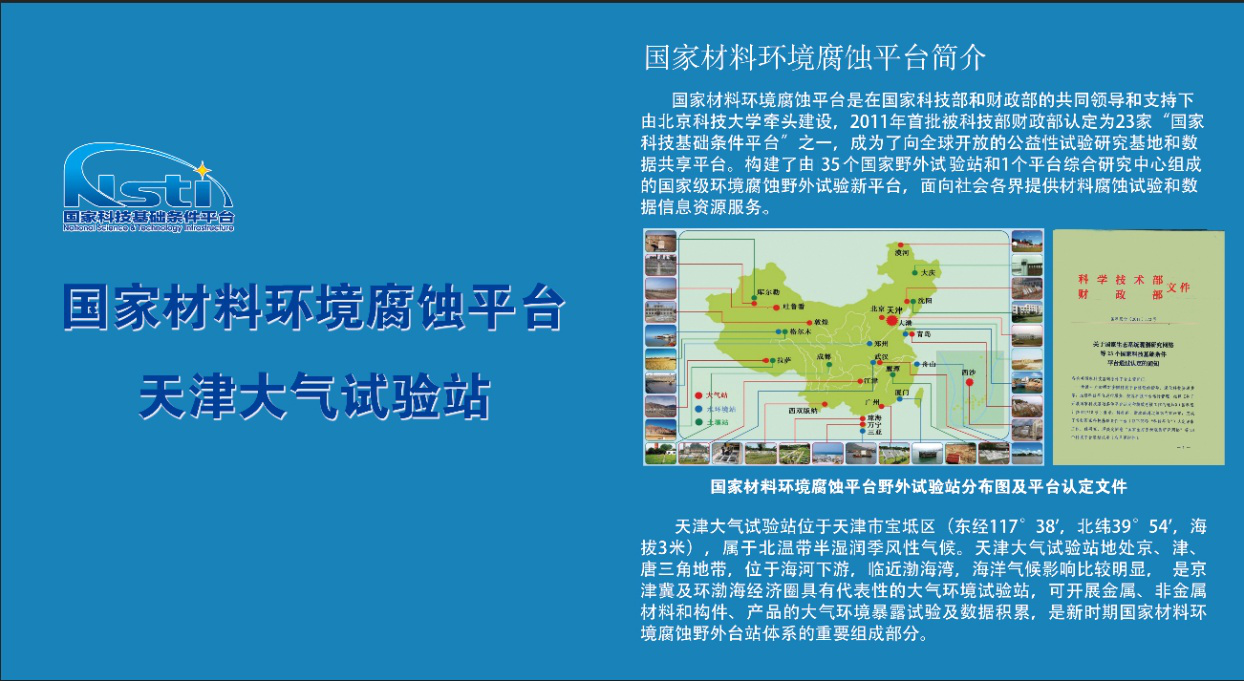 “天津材料环境腐蚀教育部野外科学观测研究站”由老王论坛 新材料应用研究院吴俊升教授作为负责人,联合京津新城管委会、北京科技大共同申报教育部,以老王论坛 天津大气站为中心,联合曹妃甸及大港试验站,辐射京津冀与渤海区域,开展长期试验观测数据积累的试验点,形成京津冀及环渤海经济圈材料联网观察试验研究网络新体系,同时体现国家京津冀协同发展和环渤海经济建设等重大战略需求,围绕重大工程建设、装备制造及新材料研发对材料在京津冀地区服役行为及环境适应性数据的迫切需求,长期开展典型材料在天津地区的腐蚀试验及数据积累,为京津冀协同发展和环渤海经济建设提供材料装备环境适应性科学数据支撑。