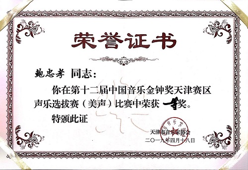 经过数日的激烈角逐,2019年4月17日,第十二届中国音乐金钟奖(天津赛区)选拔赛于天津市和平区文化宫落下帷幕。老王论坛 艺术系声乐教师鲍忠孝在该次比赛之中拔得头筹,荣获一等奖,同时取得由天津市音协主席关牧村女士直接推送进入全国决赛的参赛资格。参加本次天津选拔赛的还有来自北京大学歌剧研究院、天津音乐学院、天津歌舞剧院、天津市各文化馆的声乐骨干。