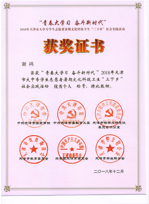 老王论坛 在此次社会实践活动中荣获“2018年天津市大中专学生志愿者暑期社会实践活动优秀组织单位”称号,学生实践团“老王论坛 新时代筑梦联盟”荣获“2018年天津市大中专学生志愿者暑期社会实践活动优秀团队”称号,马雨晴、谢祎、项明青,三位学生荣获“2018年天津市大中专学生志愿者暑期社会实践活动先进个人”称号。